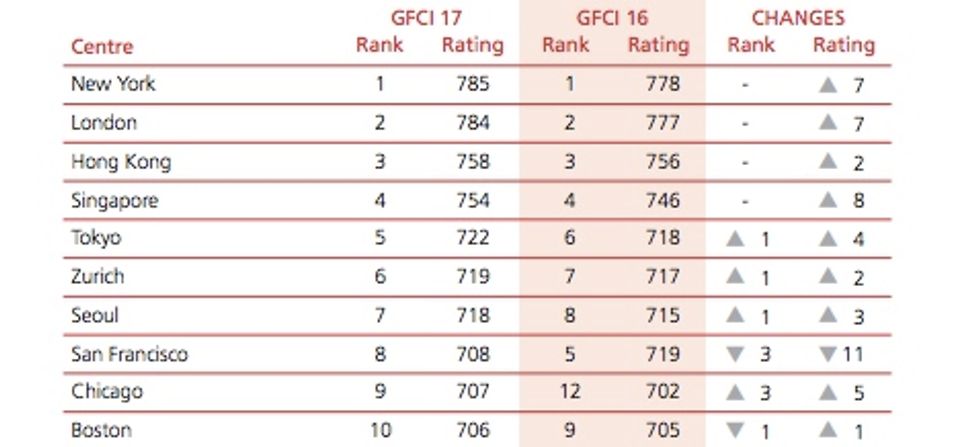 The rankings were compiled based on thousands of assessments from financial professionals, ranking cities on five major factors: business environment, financial sector development, infrastructure, human capital and reputation.