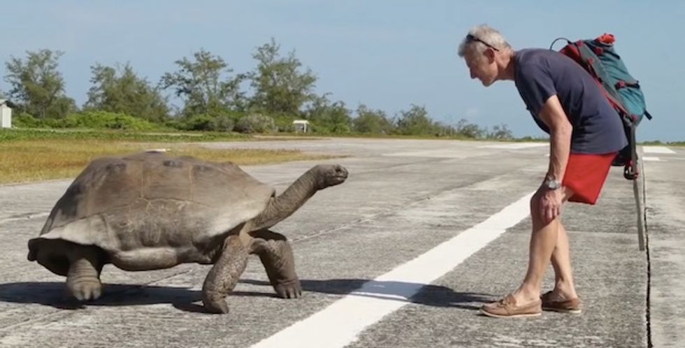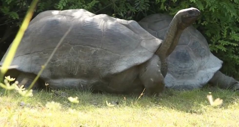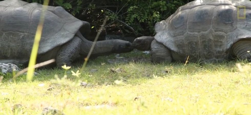Two hundred yards from where he first heard the noise, Rose stumbled upon a pair of Aldabra tortoises. He believes that he interrupted their mating session.