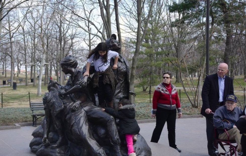 The photo was taken by artist Matthew Munson, who posted it — along with others he took of sites in the nation's capital — to his Facebook page Tuesday, calling the image "a very powerful one of two little brats climbing over war memorial right in front of a veteran. It was a sobering moment."