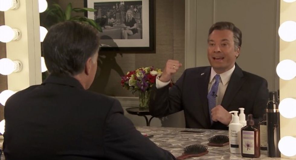The skit centered around Romney talking to his "reflection" in the mirror, played by host Jimmy Fallon, as he prepared for his appearance on the late-night comedy show.
