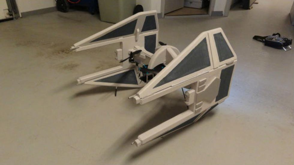 Oliver C. attaches custom housing to regular quadcopters. His latest, a mockup of an Imperial Star Destroyer, is equipped with LED lights and is capable of flying both during the daytime and at night. It also has a GoPro camera, radio system and flight controller installed, according to the YouTube video description.