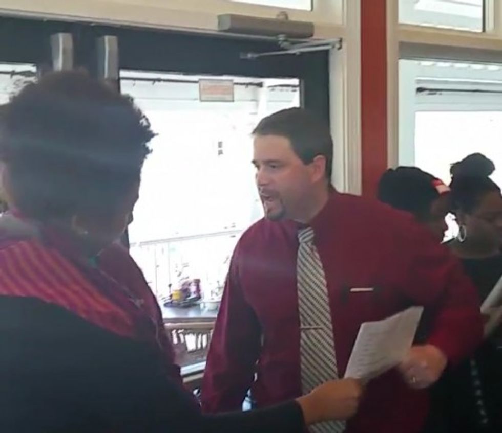 In this clip a man who appeared to be a manager attempted to get protesters out of the eatery to no avail — not even when a woman told them, "You're scaring the children!"
