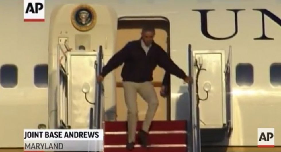 Obama was returning from a weekend golf trip in Florida where he met with oil and private equity moguls. As he began to trot down the steps, he was forced to grab the handrails for stability when he lost is footing.