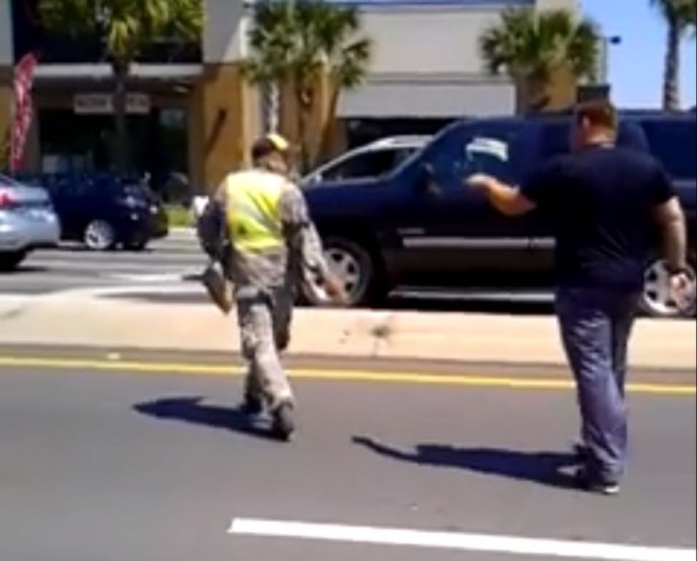 Video posted online by a Florida veteran captured the moment he confronted a panhandler wearing an army uniform outside MacDill Air Force Base on Monday.