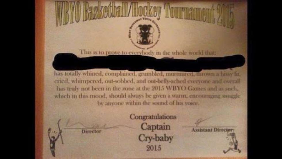 A certificate declaring an 8-year-old boy participating in a youth sports program in Winnipeg, Canada, to be "Captain Cry-baby" was meant to be a joke. At least, that's what Ken Opaleke, director of the West Broadway Youth Organization told the press and parents who called with questions about the appropriateness of the certificate.