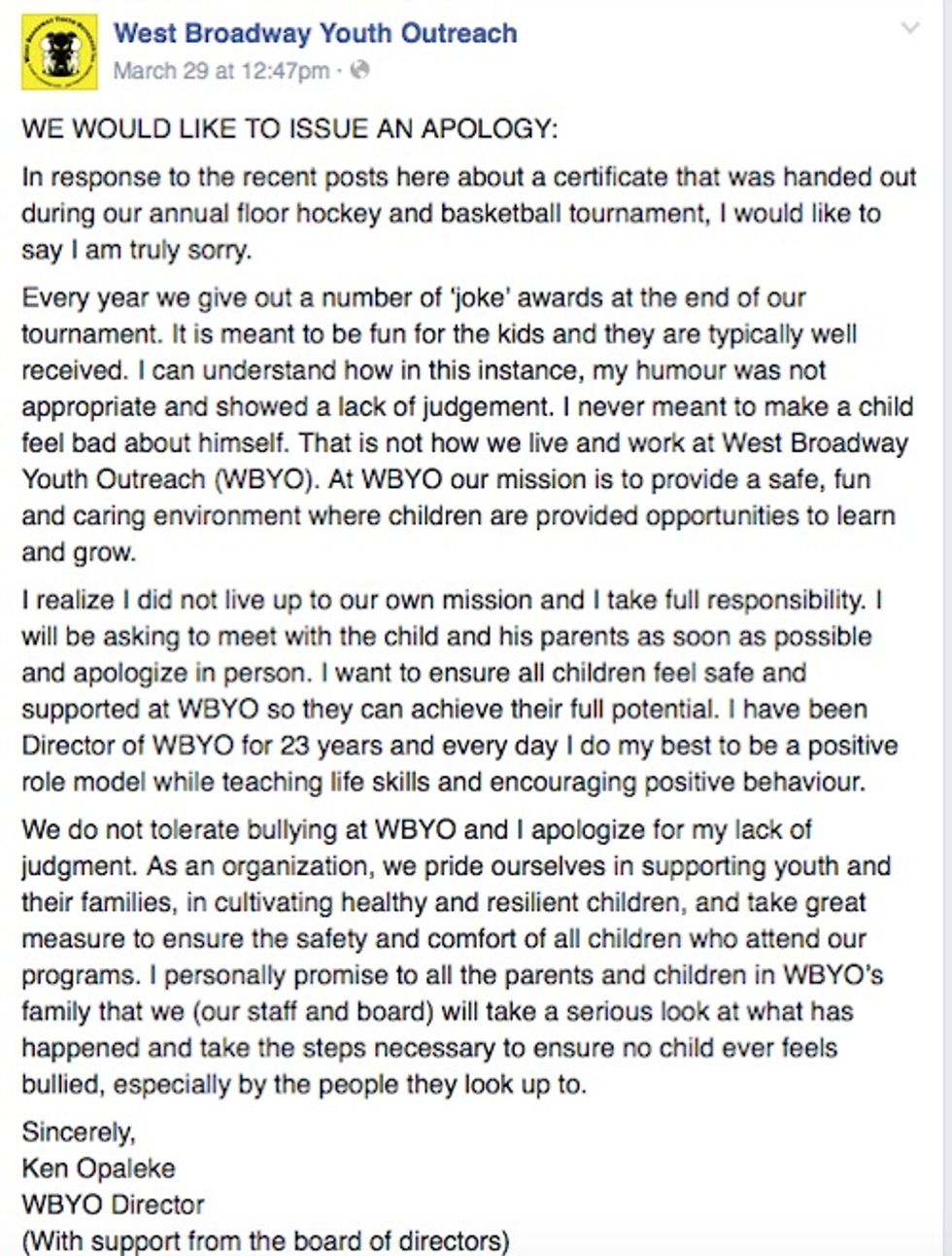 Following all of the reaction to the certificate, on Sunday, the West Broadway Youth Outreach's director issued a formal apology and posted it on Facebook.