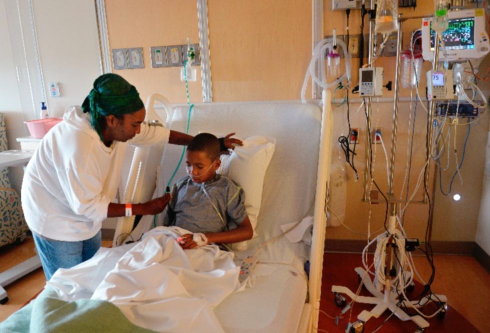 In this Monday, Sept. 8, 2014 photo, Melissa Lewis, of Denver, helps her son, Jayden Broadway, 9, as he coughs in his bed at the Children's Hospital Colorado in Aurora, Colo. He was treated for the enterovirus 68 and released, but his asthma made the illness more difficult to fight. (AP/The Denver Post, Cyrus McCrimmon)