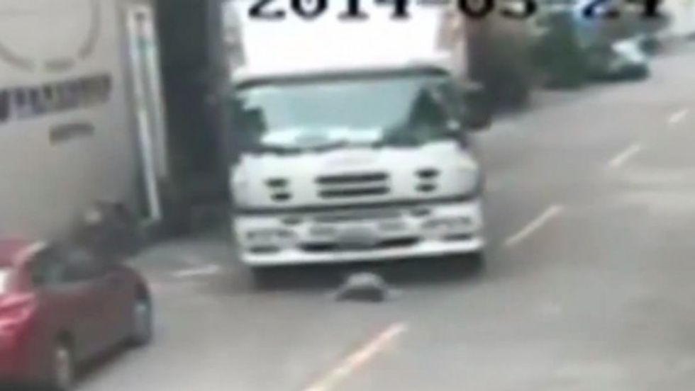The woman seemingly collapsed directly between the wheels. She struggled to sit up after the truck drove off, and was quickly surrounded by onlookers offering assistance.