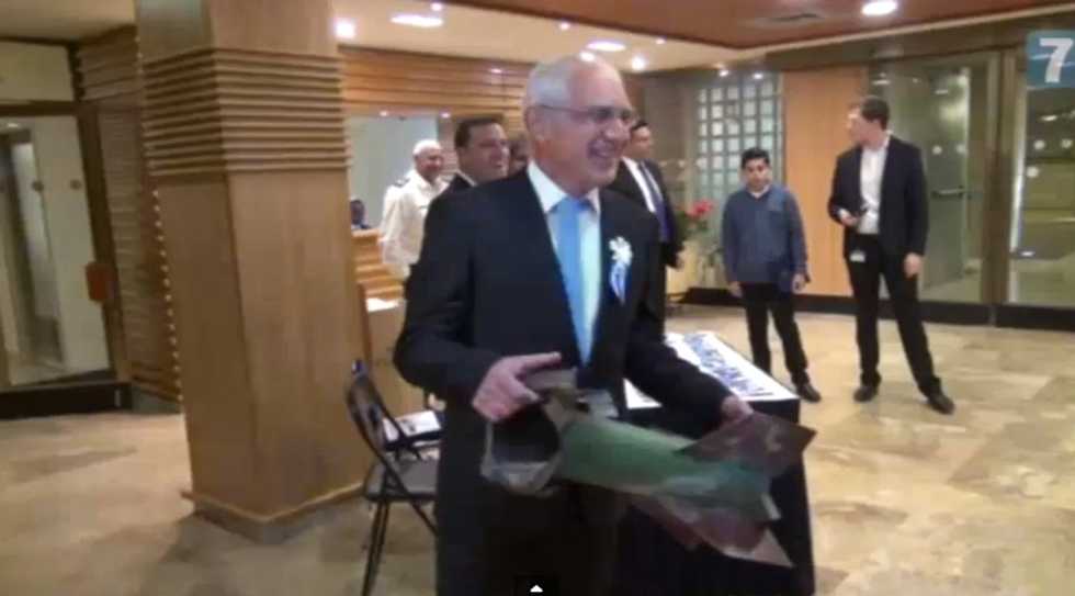 Israel’s Arutz Sheva caught Yellin as he arrived at the Knesset Tuesday with his office decoration: