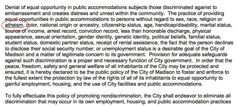 "This is important because I believe it is only fair that if we protect religion, in all its varieties, we should also protect non-religion from discrimination. It's only fair," Anita Weier, a member of the common council, told WISC-TV. "There are many categories that are protected. And it did occur to me that if religion was then perhaps the opposite should be."