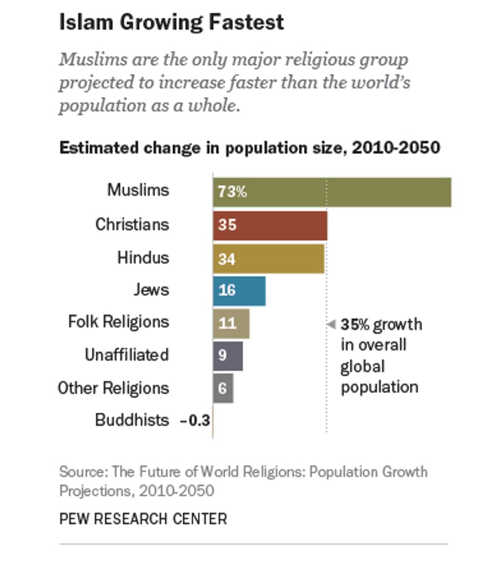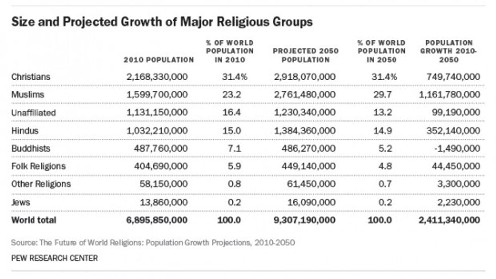 "Between 2010 and 2050, the world’s total population is expected to rise to 9.3 billion, a 35% increase," Pew reported. "Over that same period, Muslims – a comparatively youthful population with high fertility rates – are projected to increase by 73%. The number of Christians also is projected to rise, but more slowly, at about the same rate (35%) as the global population overall."