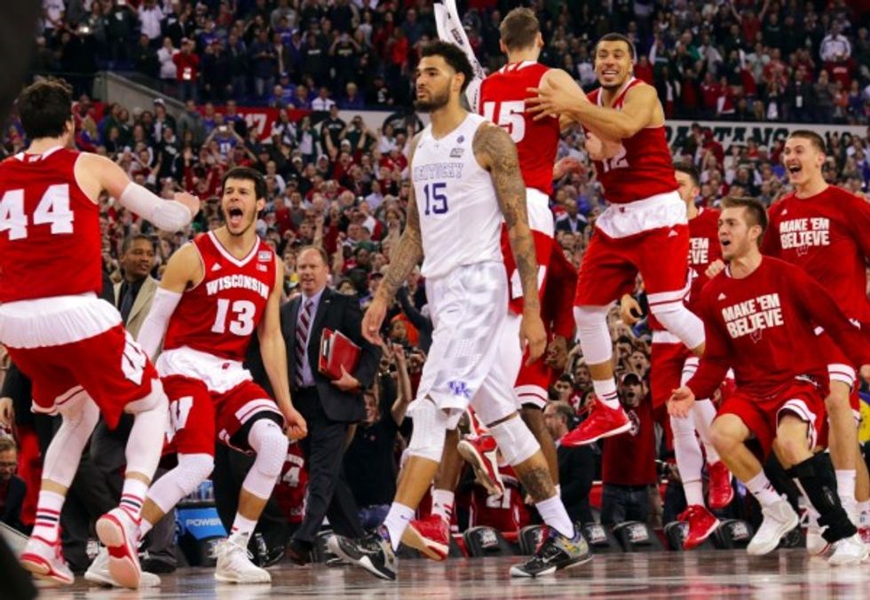 Wisconsin's bench celebrates as Kentucky's Willie Cauley-Stein walks off after the NCAA Final Four tournament college basketball semifinal game Saturday, April 4, 2015, in Indianapolis. Wisconsin won 71-64. (Image source: AP/David J. Phillip)