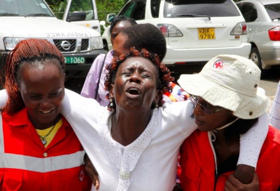 Red Cross staff console a woman after she viewed the body of a relative killed in Thursday's attack on a university, at Chiromo funeral home, Nairobi, Kenya, Sunday, April 5, 2015. (Image source: AP/Khalil Senosi)