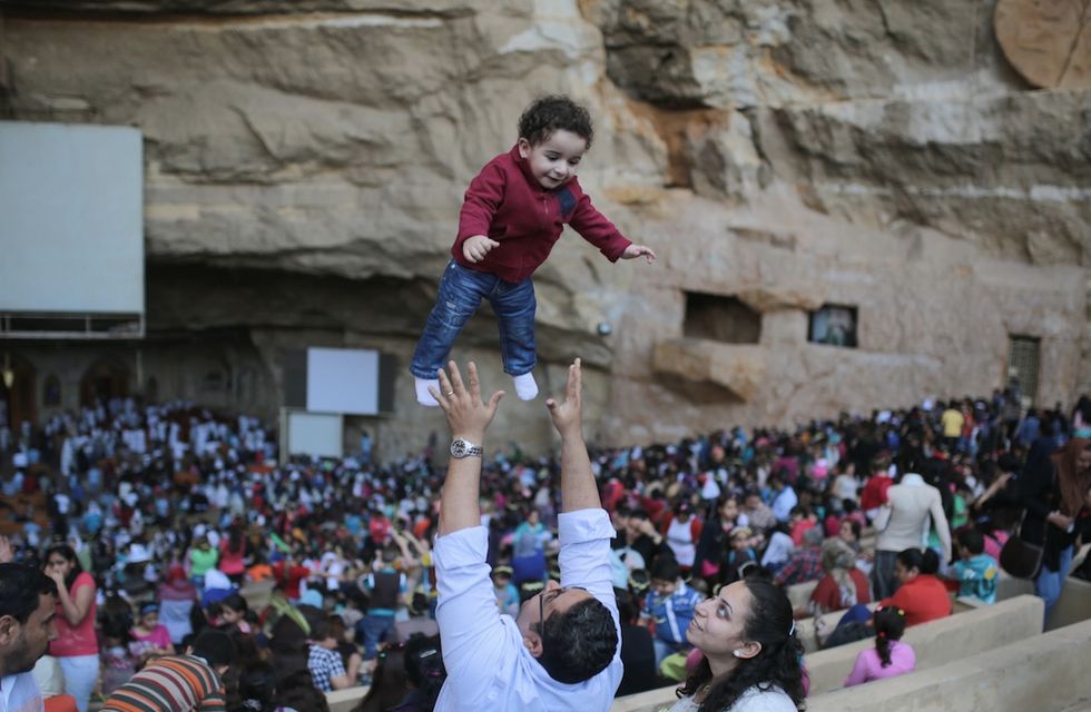 Egyptian Orthodox Christians celebrate Palm Sunday during a service in the Samaan el-Kharaz Church in the Mokattam district of Cairo, Egypt, Sunday, April 5, 2015. For Christians worldwide, Palm Sunday marks Jesus Christ's entrance into Jerusalem, when his followers laid palm branches in his path, prior to his crucifixion. Western Christian churches and most Orthodox Christian churches follow different calendars and observe Easter on different dates. (AP Photo/Mosa'ab Elshamy)