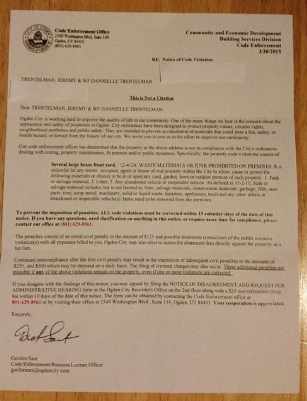 The notice left on the Trentelmans' door indicated the fort violates city code related to "waste materials or junk" and have 15 days to get rid of it or get socked with a $125 fine.