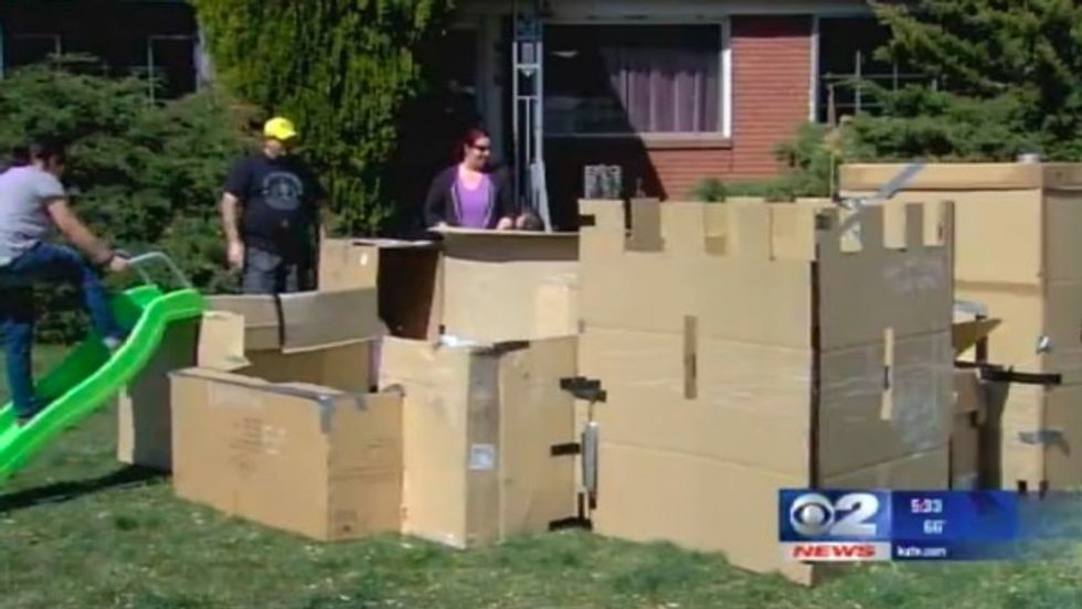 "ARE YOU FREAKIN KIDDIN ME!!!?!" he wrote on Facebook after getting the warning. "We build a completely awesome box castle in our front yard for our our kids to play in and we get a notice from code enforcement?!?"