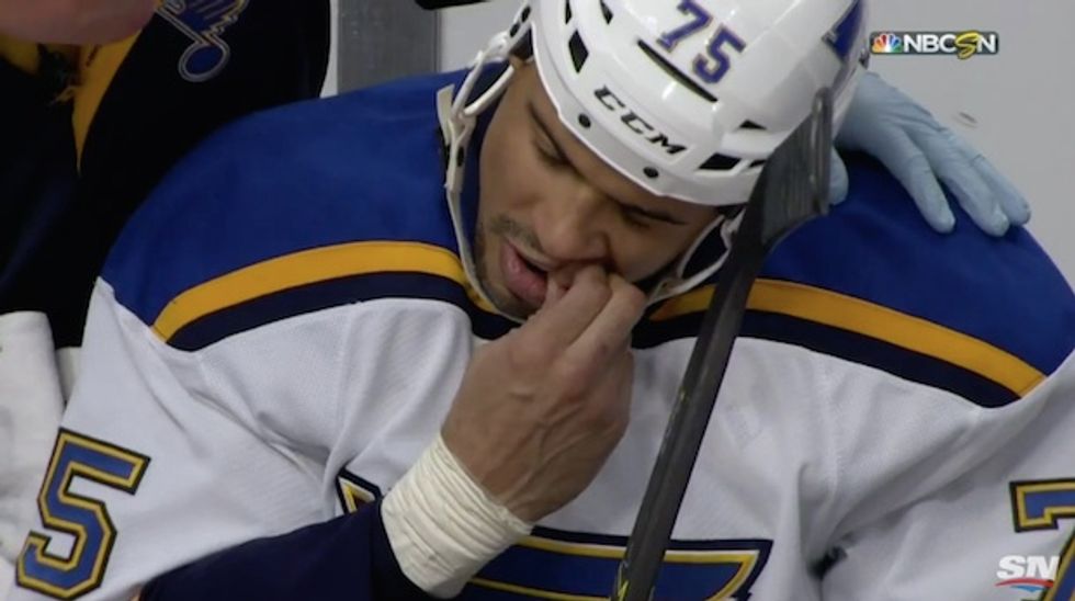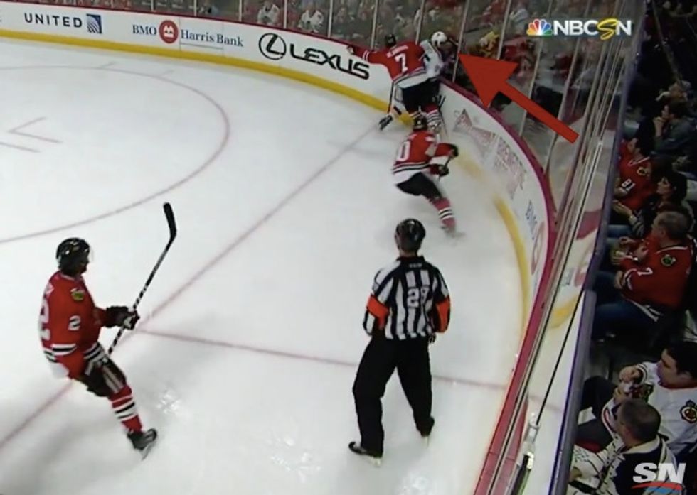 Sunday night's hockey game between the Central division-leading St. Louis Blues and the Chicago Blackhawks was a close one, with St. Louis winning 2-1. However, it was a cringe-inducing moment in the second period of the game that has become the highlight of the night.