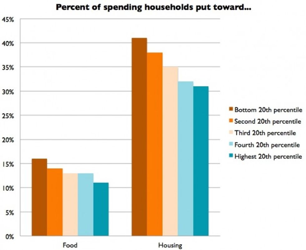 The report showed how the poorest 20 percent of American households (the bottom quintile) spend more than 40 percent of their total expenditures on housing and 16 percent on food, while the richest Americans pay a far smaller percentage of their income for food and shelter.