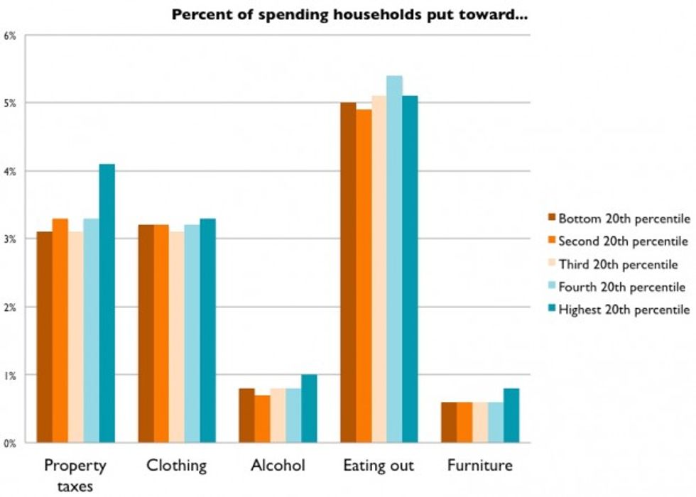 The report revealed that in a broad number of categories, rich and poor Americans spend strikingly similar chunks of their incomes on everything from property taxes to alcohol.