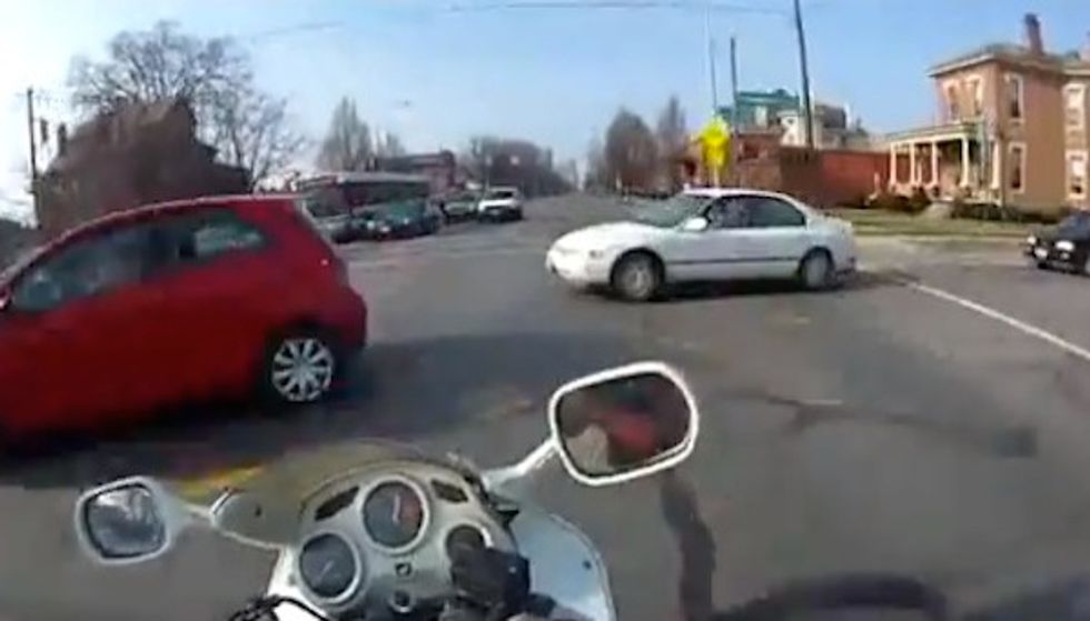 First, watch the point-of-view video of the accident shot by the motorcyclist's helmet camera (Content warning: strong language):