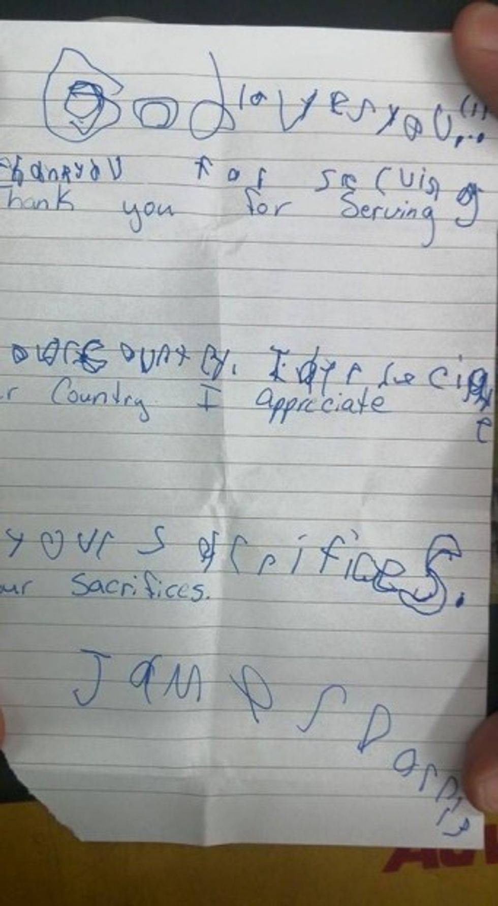 "I was surprised," Tom told WFLA-TV. "This is one of the very first notes I've ever gotten left on my vehicle, just thanking me for being a veteran, or for serving. And that did it. It brought joy to me."