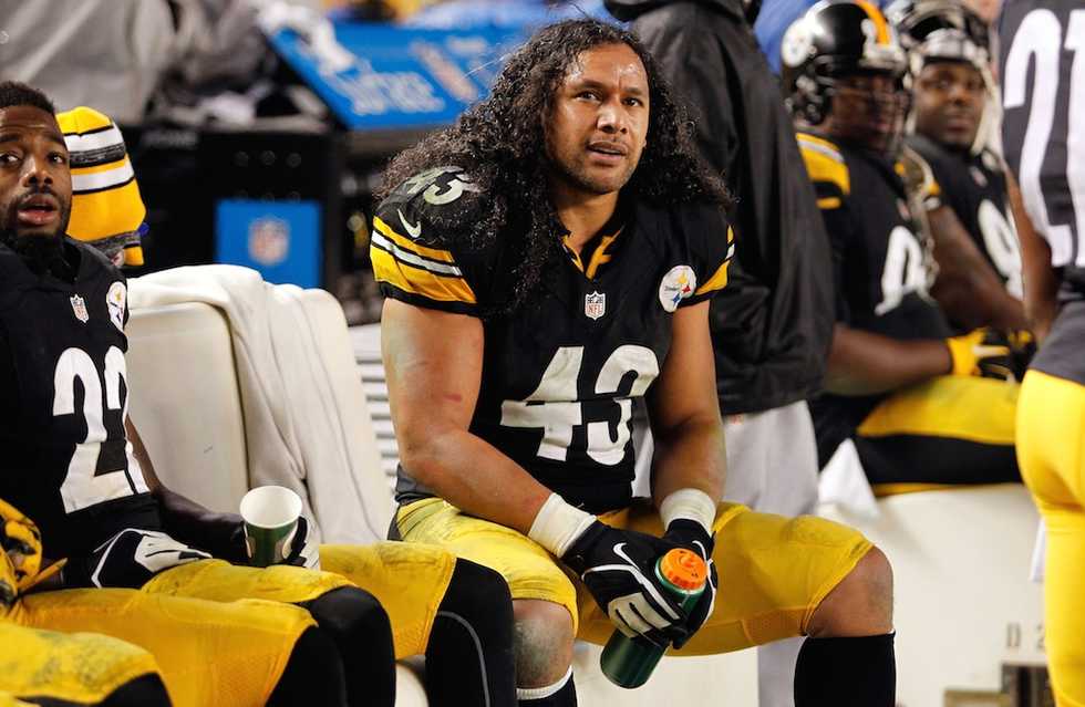 Troy Polamalu #43 of the Pittsburgh Steelers looks on from the bench against the Baltimore Ravens during their AFC Wild Card game at Heinz Field on January 3, 2015 in Pittsburgh, Pennsylvania. (Photo by Justin K. Aller/Getty Images)
