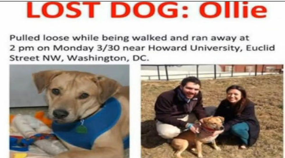 Roger Horowitz had taken their pooch for a walk March 30 when Ollie was spooked by a car that backfired. Horowitz lost his grip on the leash and Ollie took off, WRC-TV reported.
