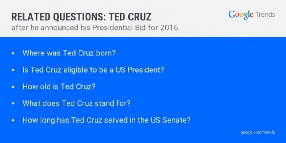 "Where was Ted Cruz born?" was the most googled question after he announced, followed by, "Is Ted Cruz eligible to be a US President?" The third most popular question for the Texas senator was in regards to his age.