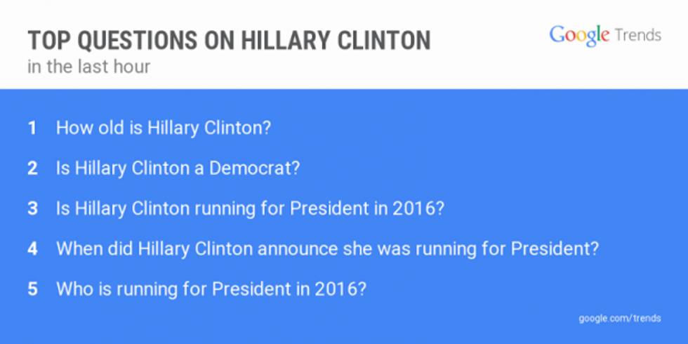 According to the data, the top search for Hillary Clinton in the hour following her announcement was concerning how old she is. The second most popular questioned asked whether or not she is a Democrat.