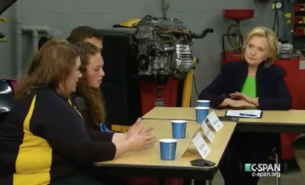 Presidential candidate Hillary Clinton's first official campaign stop in Iowa featured a "round table" discussion with six locals (three men and three women) -- a combination of students and educators at Kirkwood Community College in Monticello. That's where Clinton praised Common Core and its effects on the "most important, non-family enterprise."