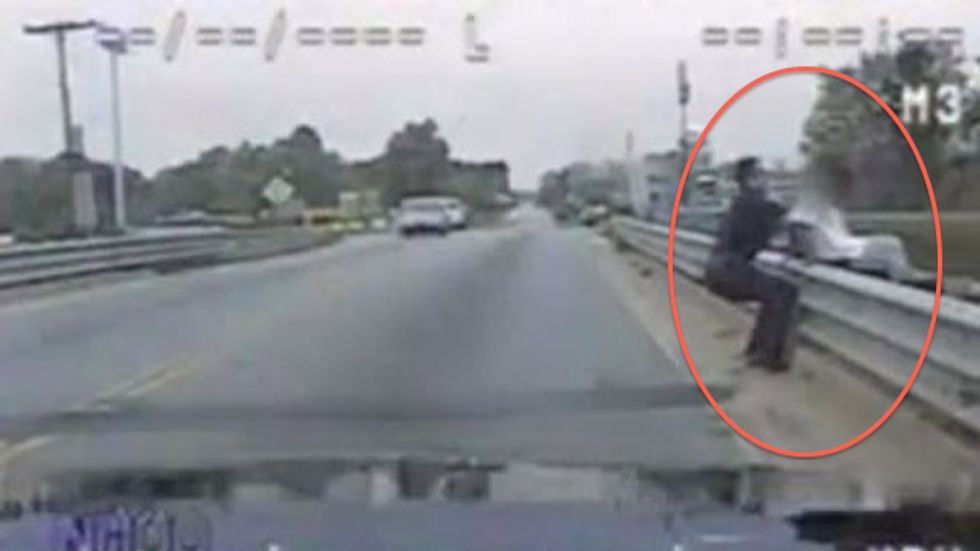 The daring rescue happened Monday in Spartanburg, South Carolina, on a bride that crosses over Interstate Highway 26. That's where the Spartanburg County officer said he saw the woman sitting, dangling her legs off the edge, WHNS reported.
