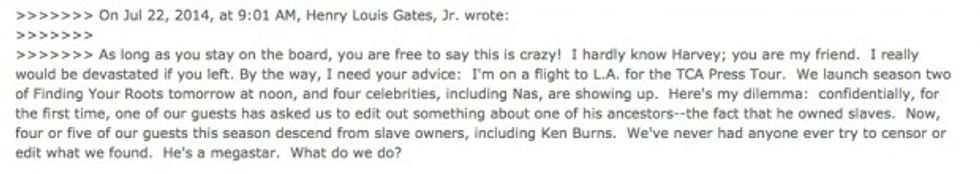 "[C]onfidentially, for the first time, one of our guests has asked us to edit out something about one of his ancestors--the fact that he owned slaves," wrote Henry Louis Gates, Jr., the host of the program, in an email to Sony Entertainment CEO Michael Lynton.