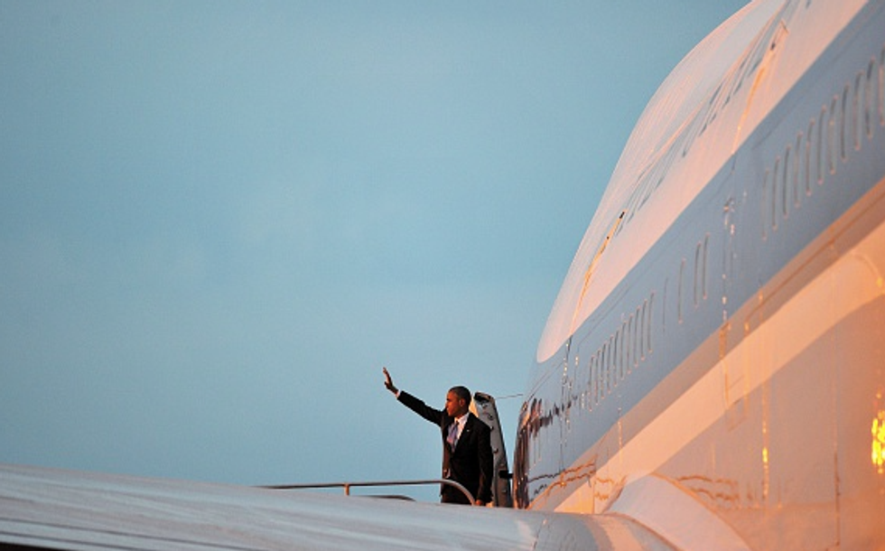 President Barack Obama waves before boarding the Air Force One at Tocumen International Airport in Panama City on April 11, 2015, after attending the VII Americas Summit. AFP PHOTO/MANDEL NGAN (Photo credit should read MANDEL NGAN/AFP/Getty Images)