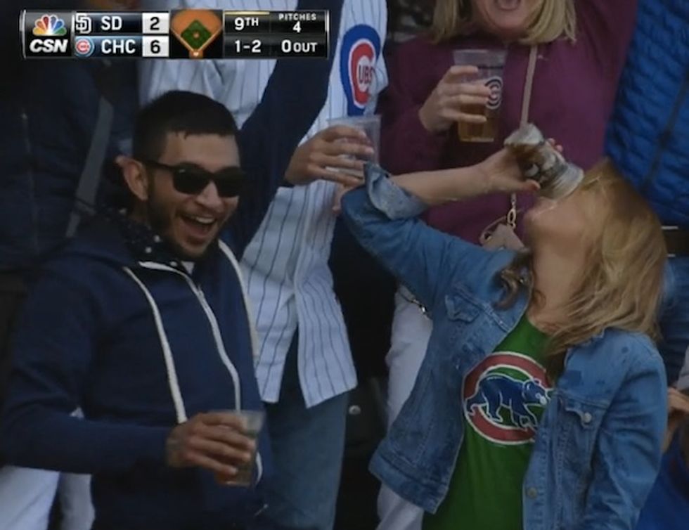 Sunday, back in Wrigley Field in Chicago, another foul ball landed in the the seats behind third base. This one also ended up in a beer cup, but the fan that caught it placed it there. Of course, he chugged the beer for the TV cameras, prompting the announcer to declare, "a new tradition is born."
