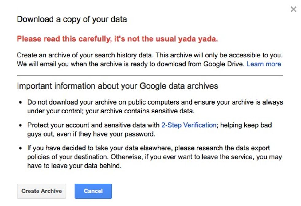 When you attempt to download your history, Google even gives this popup emphasizing to users the importance of security here.