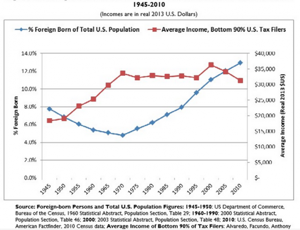 According to the CRS report, the percentage of foreign-born people in the U.S. fell between 1945 and 1970, and hit a low of about 5 percent by 1970. During that time, the average income of the bottom 90 percent of tax filers roughly doubled.
