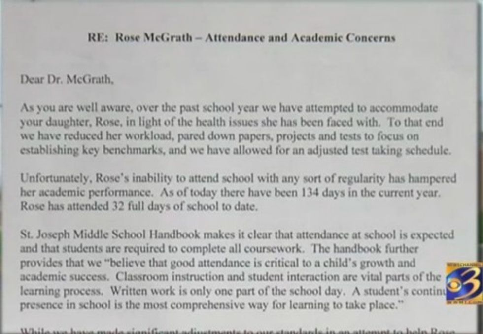 The letter added that the school tried helping McGrath by reducing her workload and adjusting test-taking schedules.