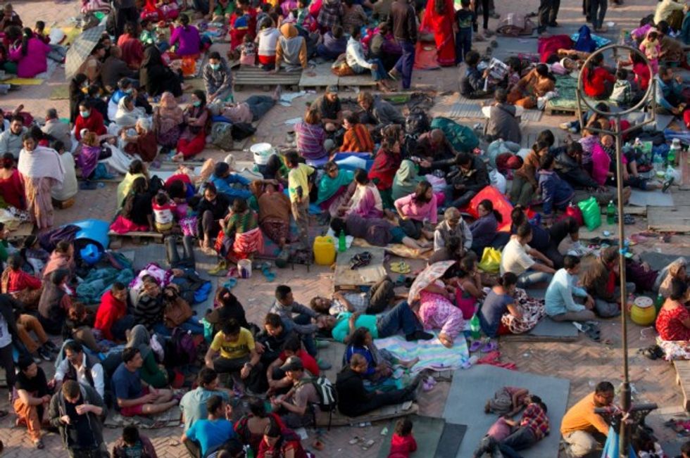 People gather on an open space for security reasons at Basantapur Durbar Square, damaged in Saturday’s earthquake, in Kathmandu, Nepal, Sunday, April 26, 2015. (Image source: AP/Bernat Armangue)\n