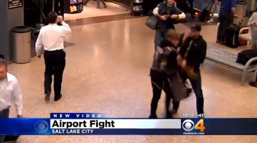 As they walked through Salt Lake City International Airport, the frustrated younger man can be seen on surveillance video throwing an unexpected punch to Hurst’s stomach.