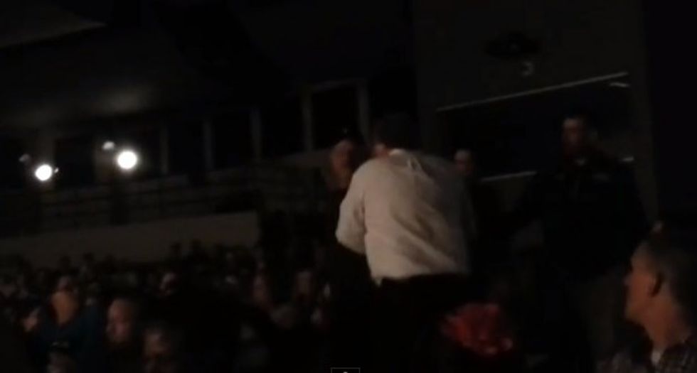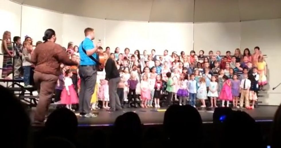 Dozens of kindergarteners stood on stage waiting to start their concert when a man interrupted a woman addressing the crowd in Spanish. (Image source: YouTube)