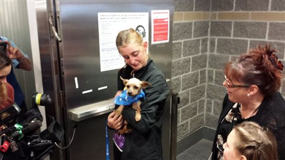 Karisa Lambert, 14, reacts as she is reunited with her Yorkshire terrier 'Sam,' picked up as a stray in Iowa, whom was stolen in 2012, at New Orleans' international airport Kenner, La., Wednesday, April 29, 2015. (AP Photo/Bill Fuller)