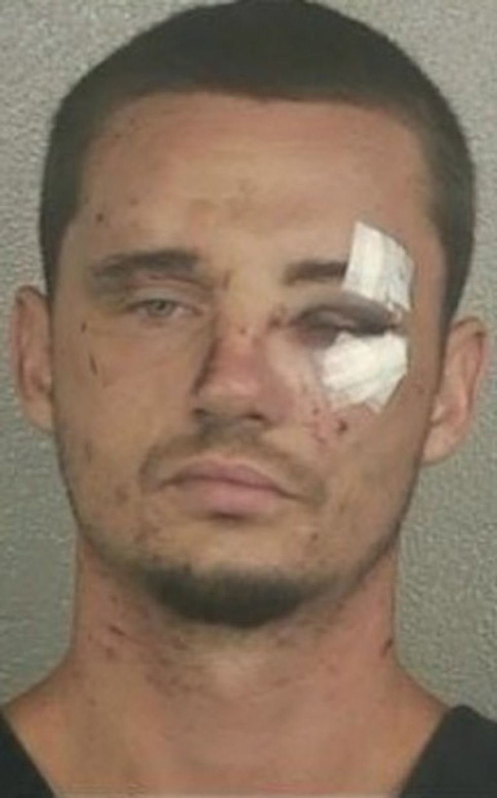 With the help of others and as evidenced by the bruises and bandages on his face in his booking mugshot, she was right.