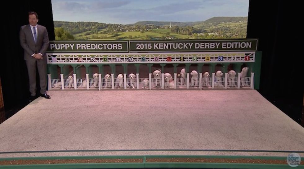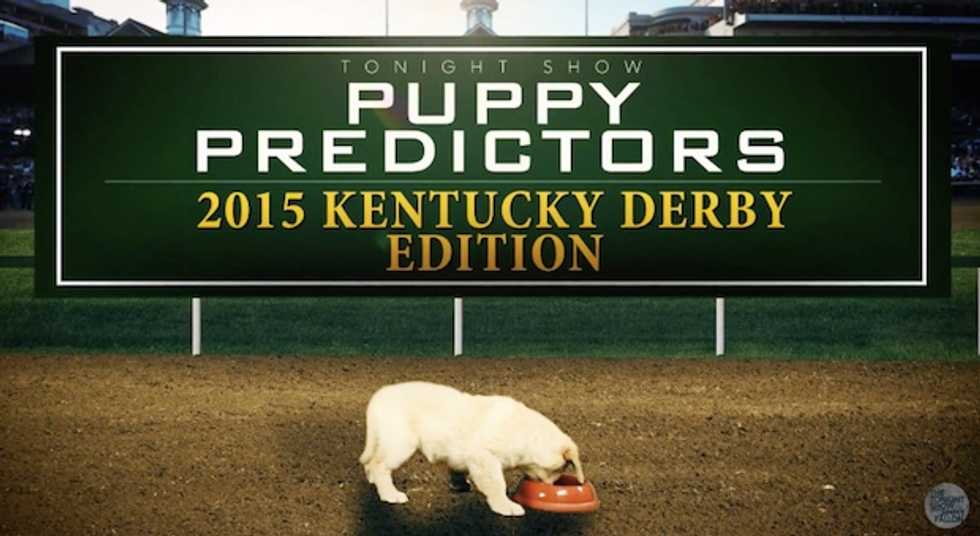 On "The Tonight Show" Wednesday, host Jimmy Fallon used a cute response to a viewer suggestion about predicting the winner of the first leg of horse racing's Triple Crown: puppies.