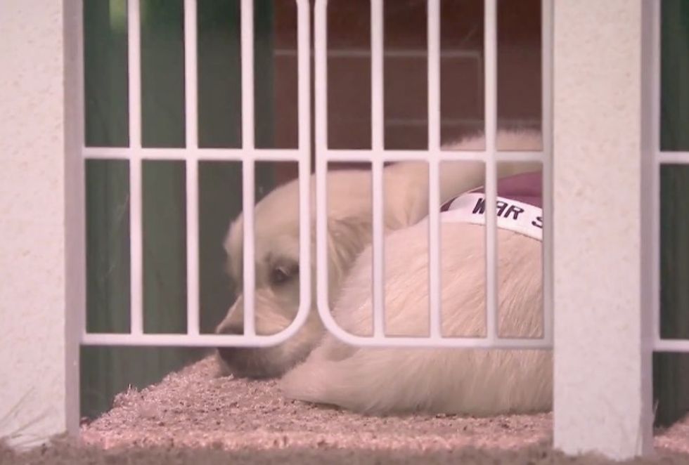 The puppies were penned in, just as the horses are at the start of the race, with a large trough of kibble at the end of the stage, just past the finish line.
