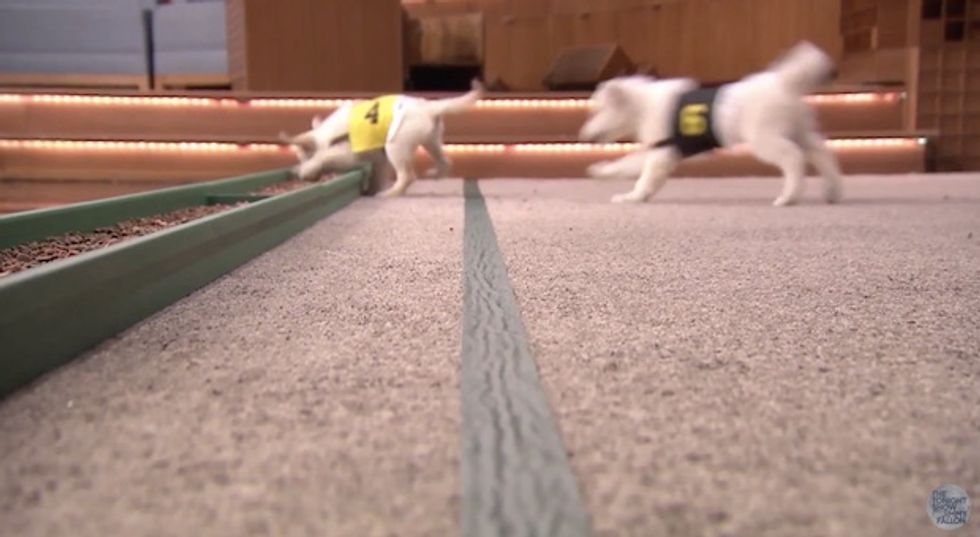 Before the gates were opened, Fallon delivered some final words of instruction, warning, "I wanna see a fair race. No peeing or butt-sniffing."