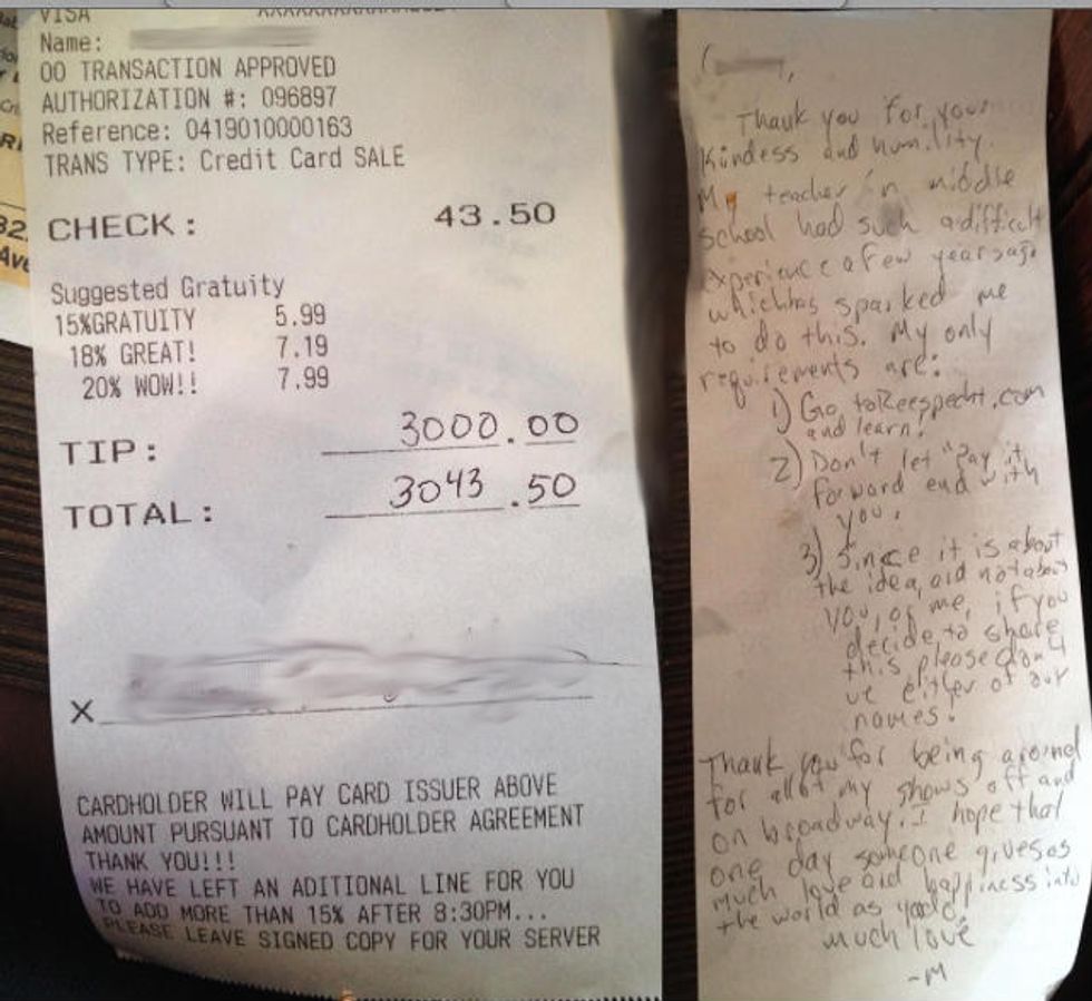 After receiving the tip, the server contacted Specht, who didn't reveal the name of the server or of his former student to WPIX, but said he feels honored that his initiative is being passed on.