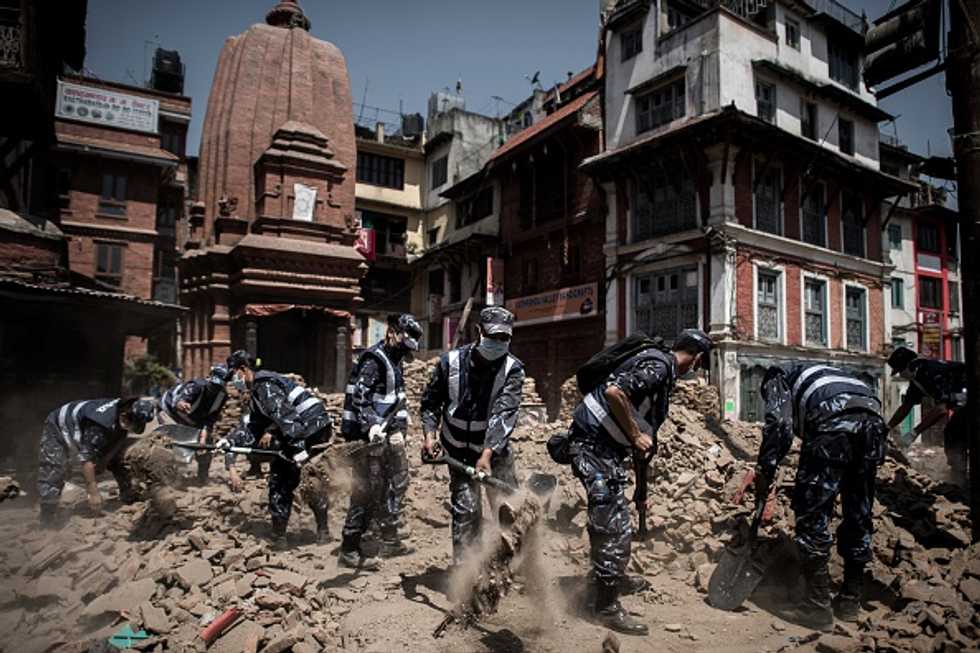 Members of the Nepalese police clear debris from the historical heritage site Durbar Square in Kathmandu on May 3, 2015, following a 7.8 magnitude earthquake which struck the Himalayan nation on April 25. The death toll in Nepal from the devastating earthquake has risen to 7,040, an official from the National Emergency Operations Centre said on May 3, 2015. (Philippe Lopez/AFP/Getty Images)