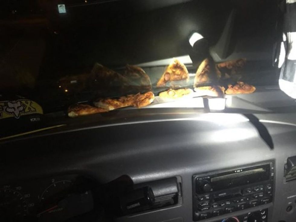About 15 minutes after he was released to a sober driver, police found the man in his car. In plain view, were several slices of pizza the man was attempting to heat up on the dashboard.