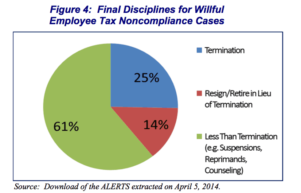 The Treasury Inspector General for Tax Administration, or TIGTA, released a report Wednesday that reviewed the IRS's ability to "address violations of tax law by its own employees." The report said that while the law calls on the IRS to fire willful violators, it also lets the IRS commissioner mitigate cases when he or she wants, and found that the last several commissioners have apparently been using this authority liberally.