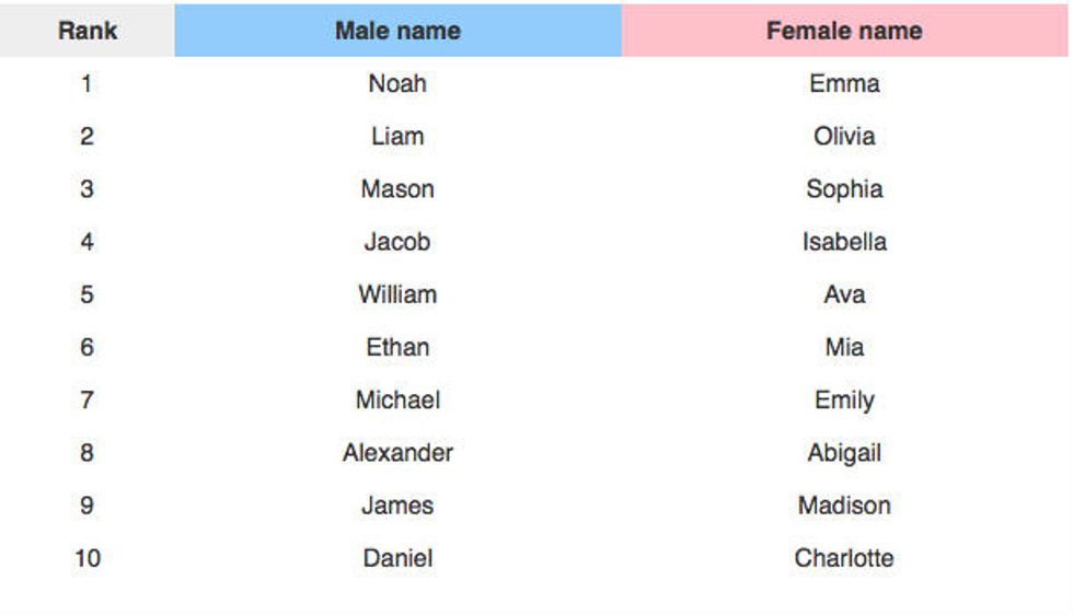 The Social Security Administration released the annual list of top baby names Friday. Emma was followed by Olivia, Sophia, Isabella and Ava. Noah was followed by Liam, Mason, Jacob and William.